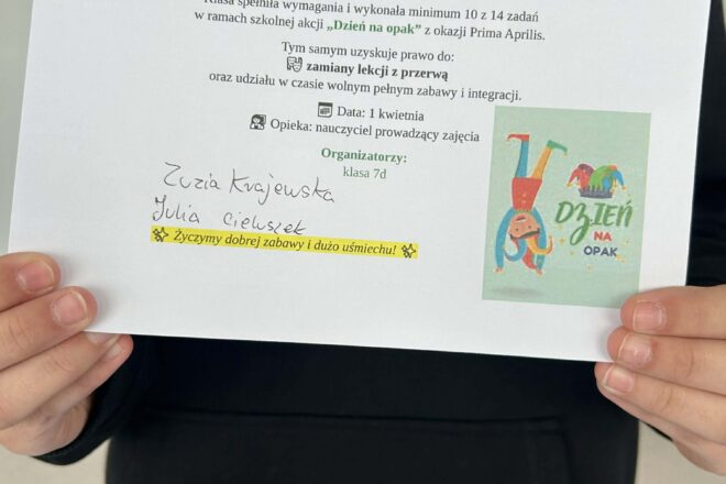 Mały Samorząd Uczniowski z radością włączył się w przygotowania do Świąt Wielkanocnych. Uczniowie własnoręcznie wykonali piękne, kolorowe kartki świąteczne, które następnie przekazali nauczycielom oraz pracownikom szkoły, składając im serdeczne życzenia. Każda kartka była wyjątkowa i pełna zaangażowania, co pokazuje, jak … Czytaj więcej