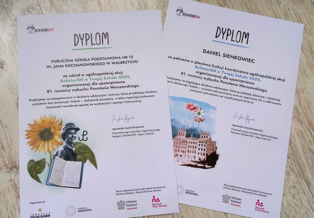 „BohaterON – włącz historię!” to ogólnopolska kampania edukacyjna o tematyce historycznej mająca na celu upamiętnienie i uhonorowanie uczestników Powstania Warszawskiego oraz promocję historii Polski XX wieku. W projekcie tym, mającym na celu wzmacnianie poczucia tożsamości narodowej, krzewienie postaw patriotycznych oraz budowanie wrażliwości społecznej wśród osób najmłodszych, wzięła również udział młodzież z naszej szkoły. Tegorocznaakcja edukacyjno-historyczna „BohaterON 2025”, skupiająca się w swoim głównym przesłaniu się na niezwykłej roli kobiet w Powstaniu Warszawskim, podkreślając ich odwagę w rolach łączniczek, sanitariuszek, kurierów, żołnierzy cieszyła się zainteresowaniem naszych uczniów;licznie wzięli oni udziałw zajęciach edukacyjnych opracowanych na podstawie scenariuszy przygotowanych przez organizatorów oraz zapoznali się z filmami edukacyjnymi dotyczącymi historii Powstania Warszawskiego. Na pamiątkę udziału w tej wyjątkowej akcji otrzymaliśmy okolicznościowe dyplomy potwierdzające zaangażowanie uczniów w tym ważnym wydarzeniu.