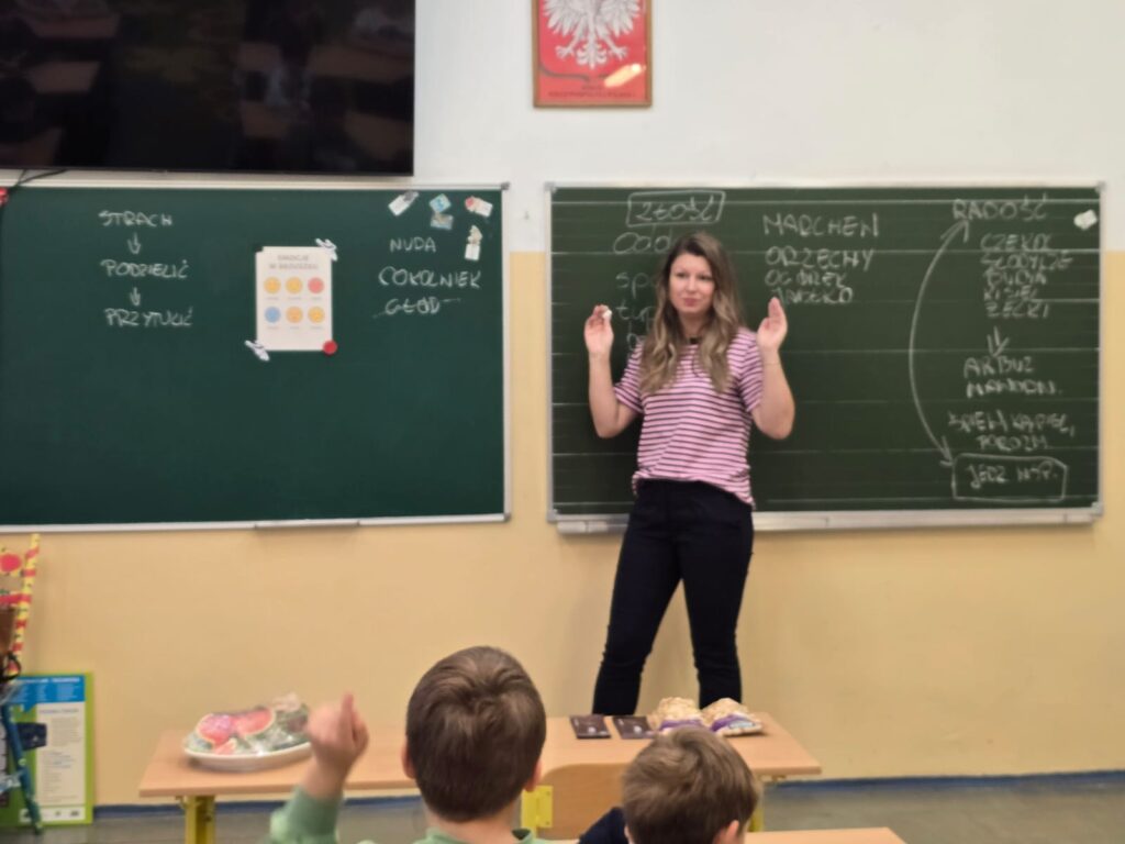 Uczniowie klasy drugiej wzięli udział w ciekawych zajęciach z dietetykiem Panią Jowitą Kurylik pt. „Emocje na talerzu”. Rozmawiali o tym, czym są emocje i jak można je rozpoznawać. Dowiedzieli się, że każdy z nas odczuwa radość, smutek, złość czy strach – i że wszystkie emocje są ważne.