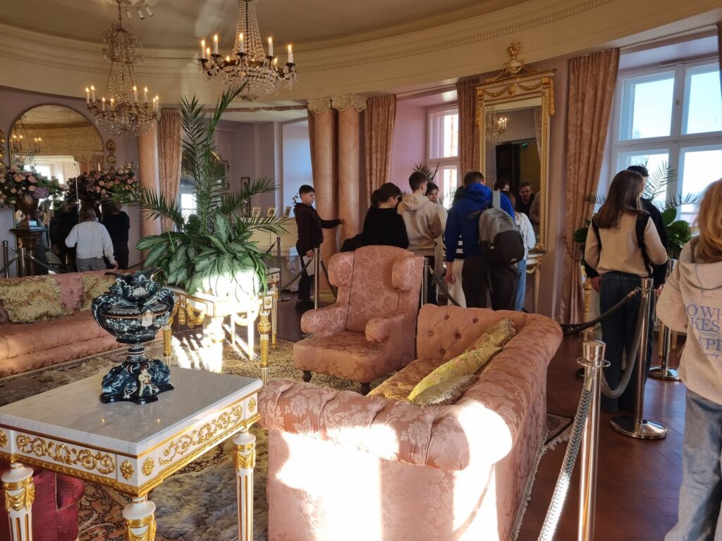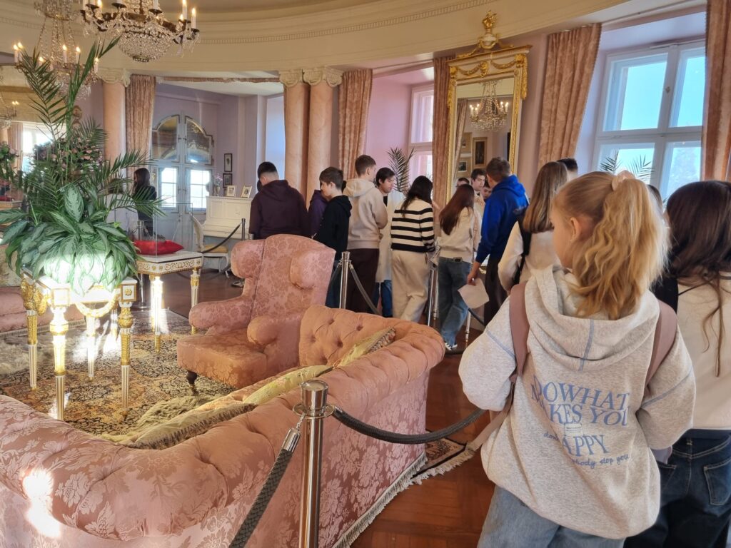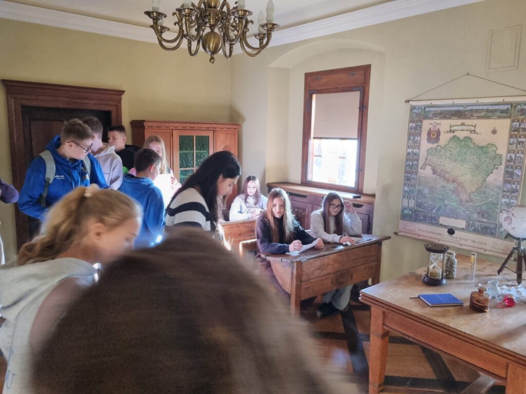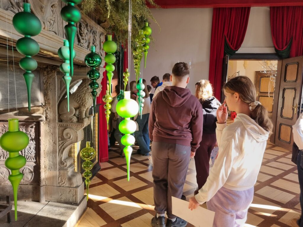 Ostatnim punktem wycieczki był Zamek Książ – jeden z największych i najpiękniejszych zamków w Polsce. Podczas zwiedzania uczniowie poznali fascynującą historię zamku oraz losy jego dawnych mieszkańców. Szczególne zainteresowanie wzbudziła postać księżnej Daisy, jej niezwykłe życie, działalność społeczną oraz związki z Zamkiem Książ. Uczniowie dowiedzieli się również, jak wyglądało codzienne życie arystokracji oraz jak na przestrzeni lat zmieniały się dzieje tej imponującej rezydencji.