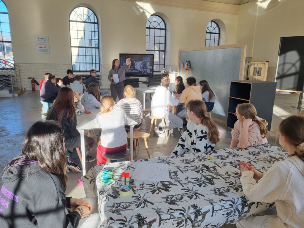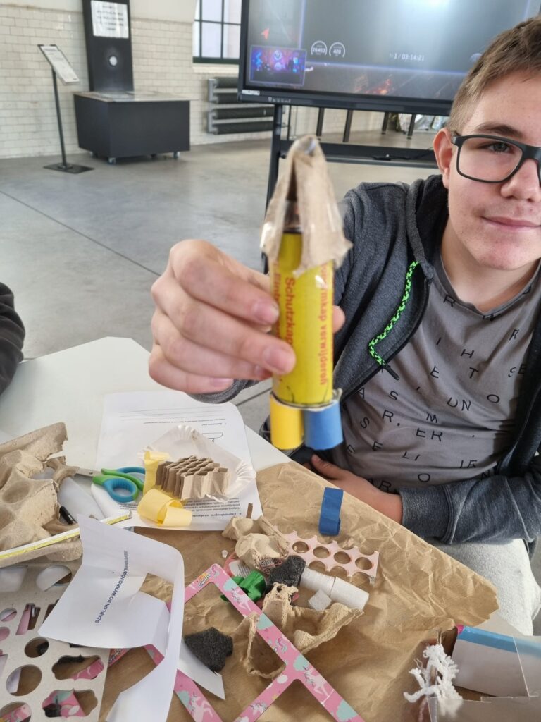 Następnie, tuż obok Starej Kopalni, klasa odwiedziła Centrum Nauki SOWA. Uczniowie wzięli udział w warsztatach poświęconych kosmosowi, podczas których rozwijali swoją kreatywność i wyobraźnię. W trakcie zajęć stworzyli projekty kombinezonów astronautów oraz modele rakiet kosmicznych, łącząc naukę z doskonałą zabawą.
