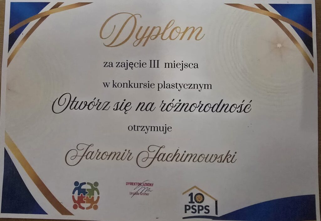 Z radością informujemy, że Jaromir Jachimowski z klasy 2b zdobył III miejsce w miejskim konkursie plastyczno-literackim „Otwórz się na różnorodność”, organizowanym przez Publiczną Szkołę Podstawową Specjalną nr 10 w Wałbrzychu.