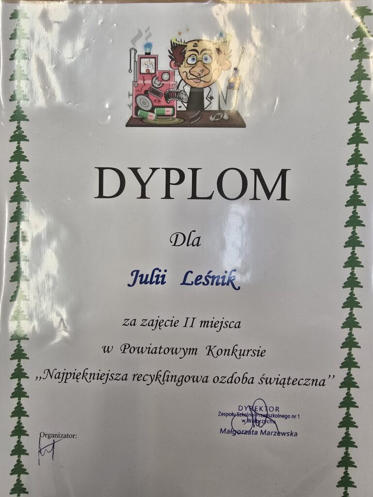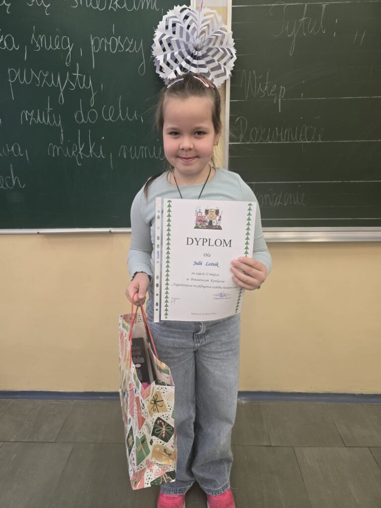 Z radością informujemy, że uczennica Julia z klasy 2b zajęła II miejsce w Powiatowym Konkursie „Najpiękniejsza recyklingowa ozdoba świąteczna”, organizowanym przez Zespół Szkolno-Przedszkolny nr 1 w Wałbrzychu. Konkurs ten podkreśla, jak ważną rolę odgrywa recykling i ponowne wykorzystanie materiałów w trosce o środowisko oraz kształtowaniu postaw ekologicznych już od najmłodszych lat. Kreatywność, pomysłowość i zaangażowanie Julii są doskonałym przykładem na to, że z odpadów mogą powstać prawdziwe dzieła sztuki. Serdecznie gratulujemy Julii sukcesu i życzymy kolejnych twórczych osiągnięć!