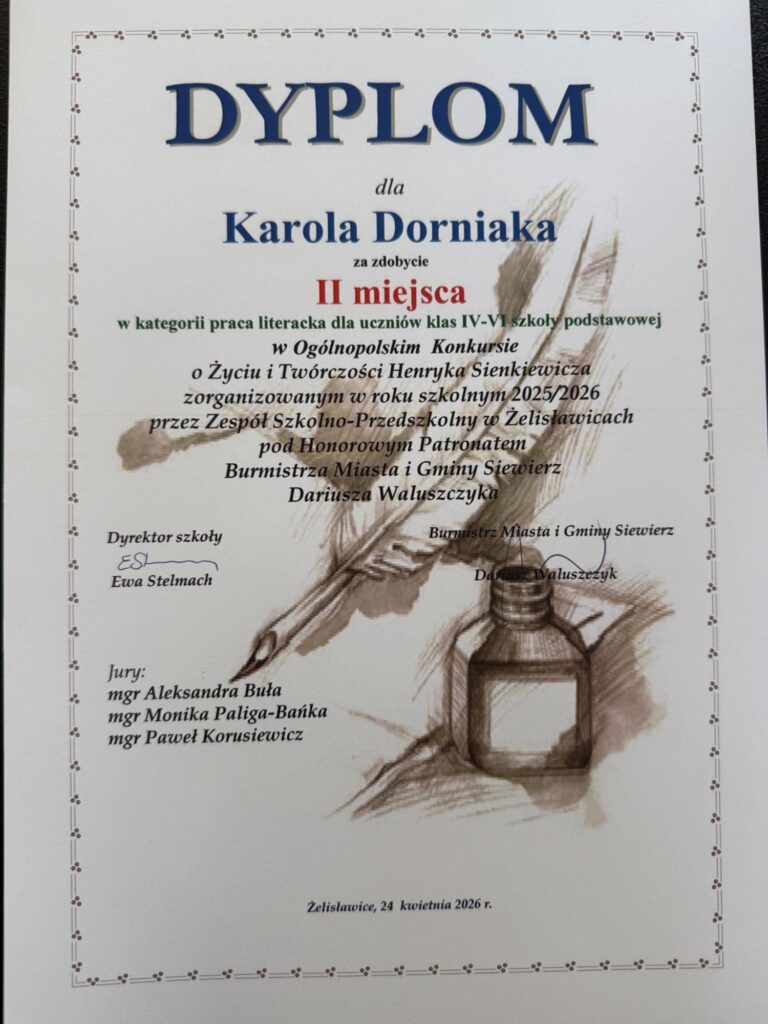 o Życiu i Twórczości Henryka Sienkiewicza, zorganizowanego przez Zespół Szkolno-Przedszkolny w Żelisławicach pod Honorowym Patronatem Burmistrza Miasta i Gminy Siewierz. Wyjątkowy sukces w tych zmaganiach odniósł uczeń Karol Dorniak z kl.Vb, który zdobył II miejsce w kategorii praca literacka dla uczniów klas IV–VI za twórcze opowiadanie o dalszych losach Janka Muzykanta. Komisja konkursowa, oceniając nadesłane utwory, brała pod uwagę przede wszystkim ich zgodność z tematem, pomysłowość i oryginalność, poprawność językową oraz realizację wyznaczników formy literackiej.