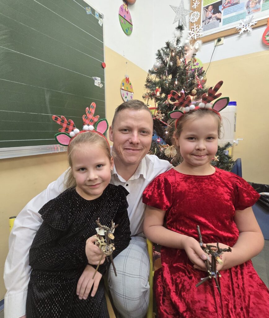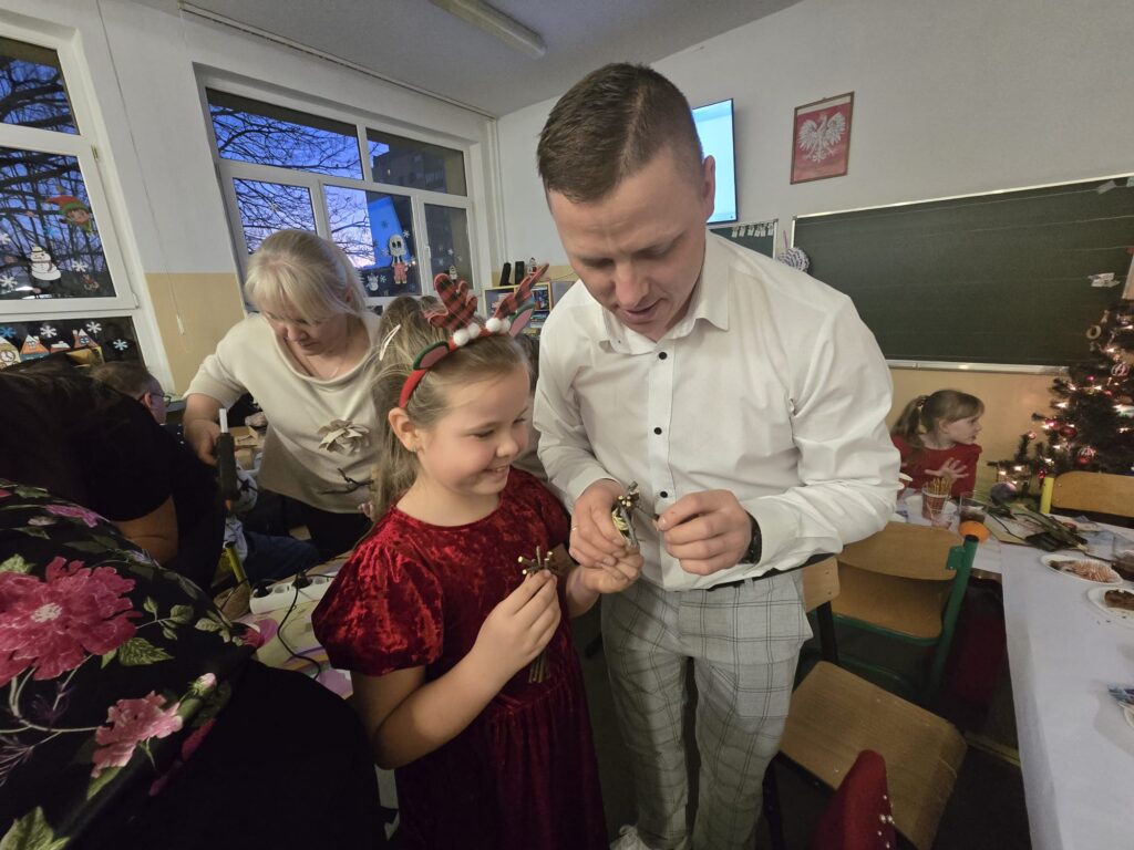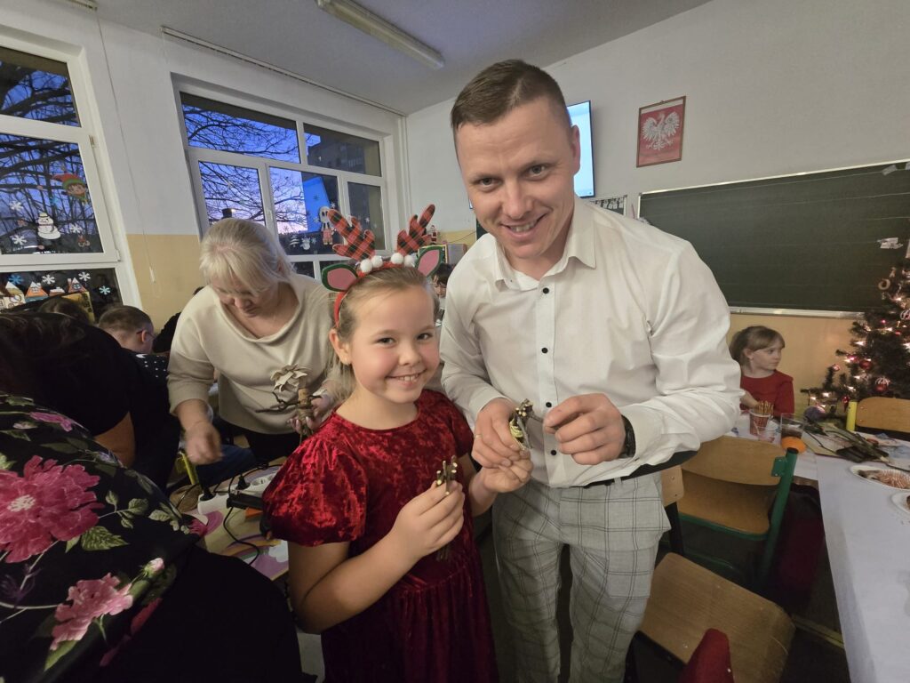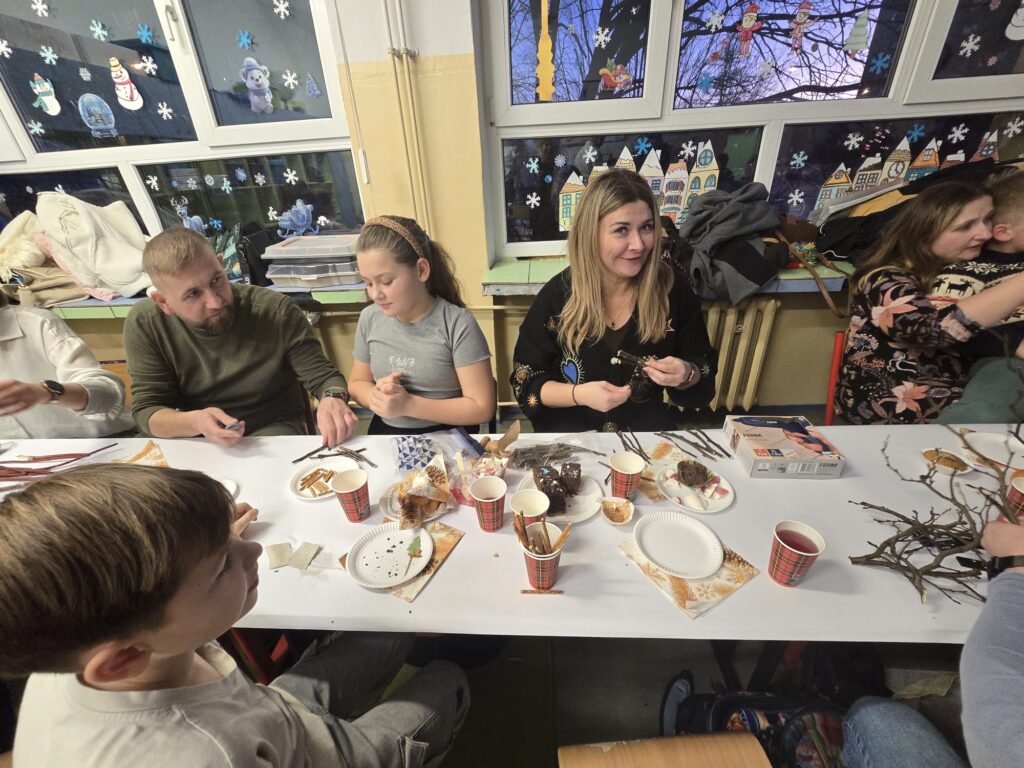 Klasa 2b przeżyła wyjątkową wigilię klasową, przygotowaną z ogromnym zaangażowaniem przez rodziców. W spotkaniu uczestniczyli również zaproszeni goście: Dyrekcja szkoły p. Paweł Łuczyński i p. Angelika Niedziela oraz bajkopisarka p. Raszka. Dzieci zaprezentowały piękne kolędy i pastorałki, wprowadzając wszystkich w świąteczny nastrój. Wspólnie złożyliśmy sobie serdeczne życzenia, a Pan Dyrektor przekazał życzenia w imieniu Dyrekcji szkoły. Pani Raszka dołączyła sie do zyczeń. Podczas spotkania odbyły się także warsztaty, na których dzieci wraz z rodzicami wykonały jelonki z gałązek i korka. Własnoręcznie przygotowane prace dzieci zabrały do domu jako pamiątkę tego wyjątkowego, wigilijnego spotkania.