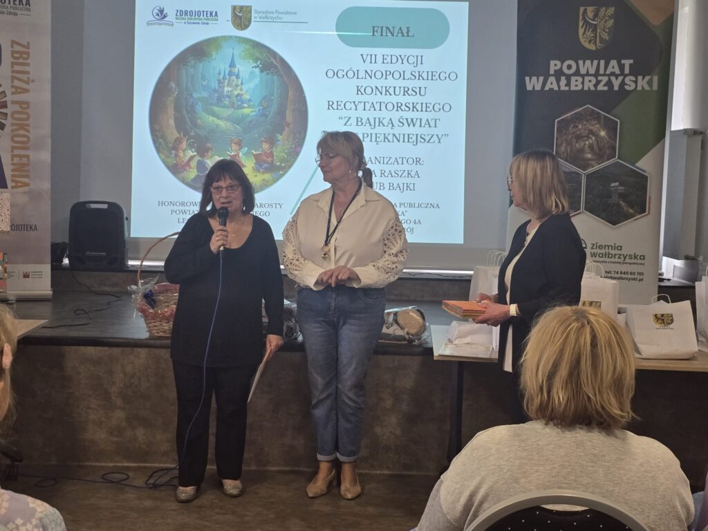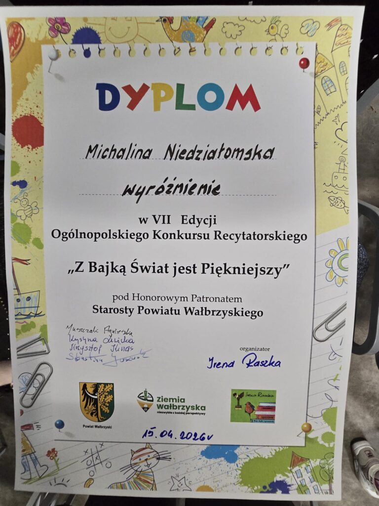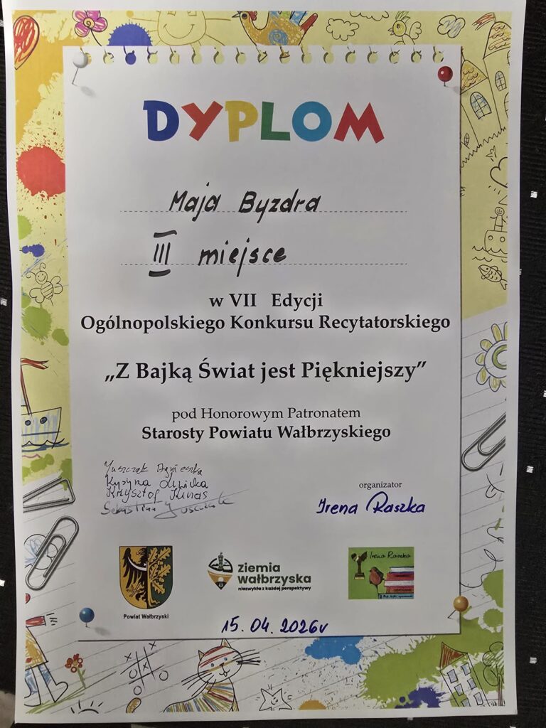 Udział w konkursach recytatorskich to nie tylko okazja do zaprezentowania swoich umiejętności, ale także piękne spotkanie z literaturą i drugim człowiekiem. Tak było również w przypadku naszych uczniów, którzy wzięli udział w wyjątkowym wydarzeniu. Z radością informujemy, że uczniowie naszej szkoły uczestniczyli w VII edycji Ogólnopolskiego Konkursu Recytatorskiego „Z bajką świat jest piękniejszy”, który odbył się w Miejskiej Bibliotece Publicznej „Zdrojoteka” w Szczawnie-Zdroju. Organizatorką wydarzenia była Pani Irena Raszka – autorka utworów dla dzieci i inicjatorka konkursu. W wydarzeniu wzięli udział uczniowie klas 0–6 z różnych szkół z całej Polski. Konkurs miał na celu popularyzowanie twórczości literackiej Ireny Raszki, propagowanie czytelnictwa, rozwijanie wyobraźni i wrażliwości dzieci, a także doskonalenie umiejętności recytatorskich oraz naukę zdrowej rywalizacji w przyjaznej atmosferze. Każdy uczestnik zaprezentował jeden wybrany wiersz, a jury oceniało występy według takich kryteriów jak dykcja, interpretacja tekstu oraz ogólne wrażenie artystyczne. Poziom konkursu był bardzo wysoki – wzięło w nim udział ponad 60 młodych recytatorów. Naszą szkołę reprezentowało sześcioro uczniów, którzy wcześniej pomyślnie przeszli eliminacje szkolne. Z dumą informujemy, że: