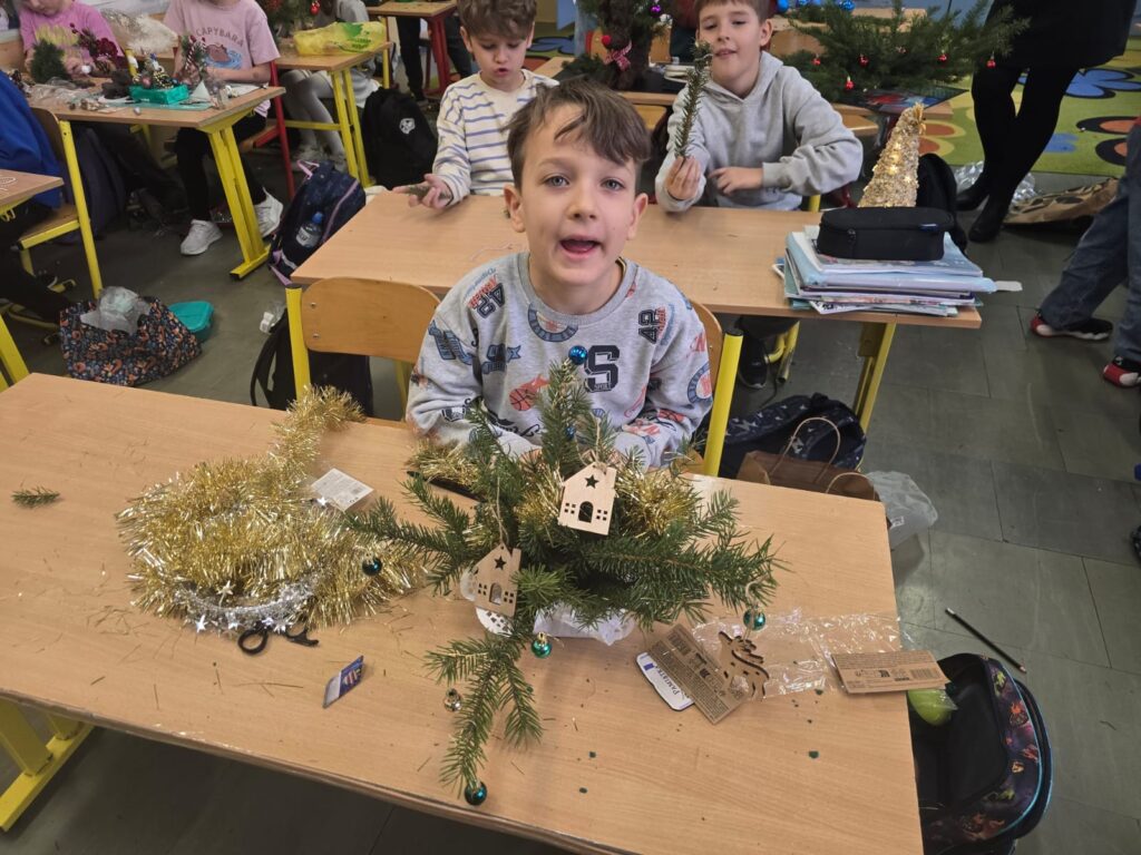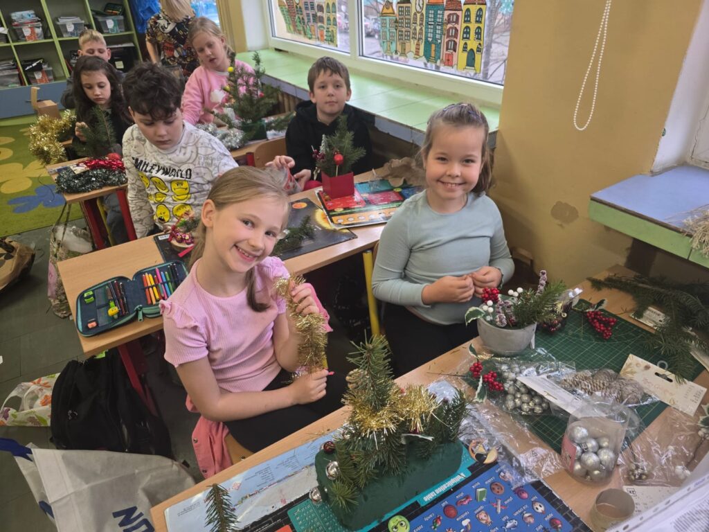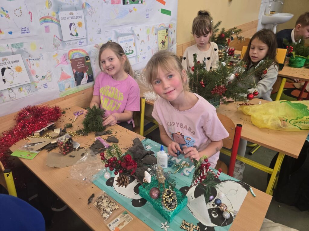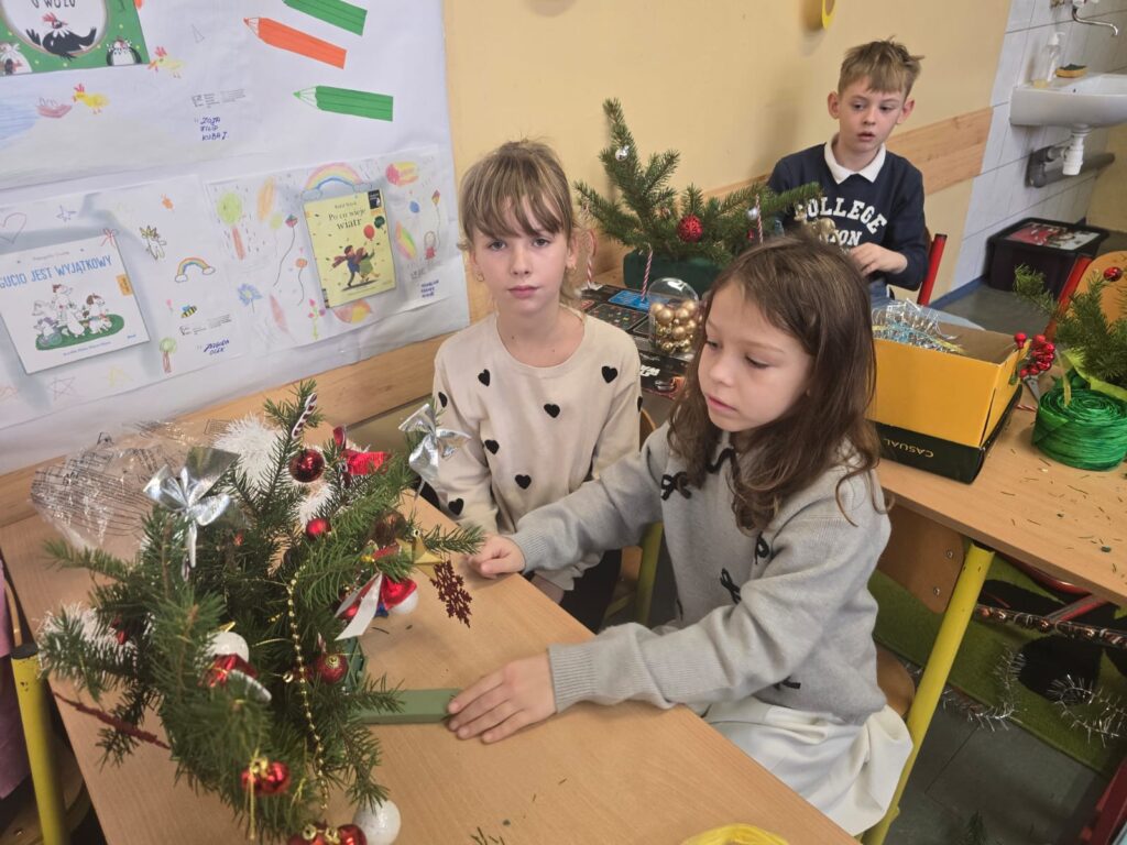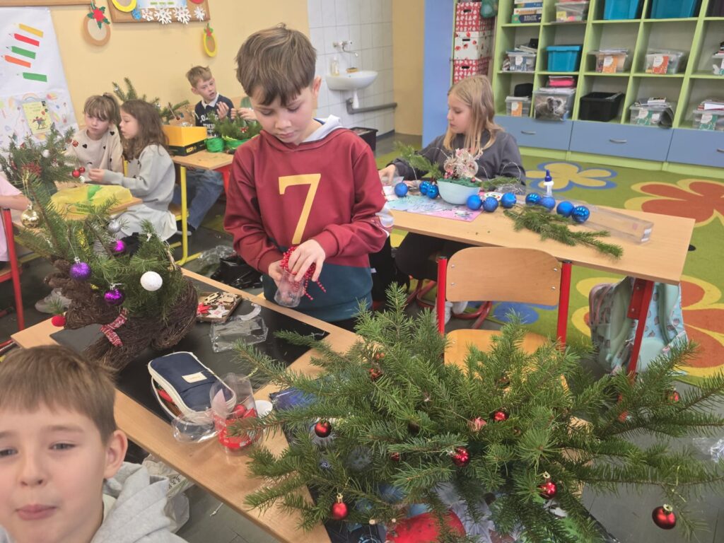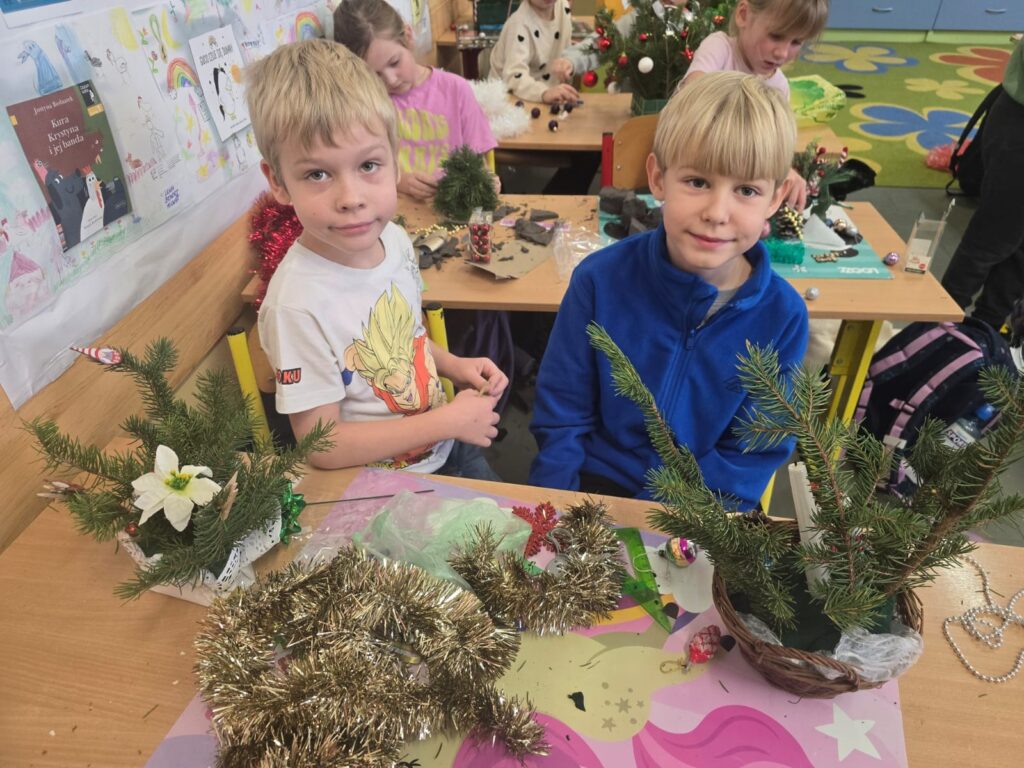 Podczas warsztatów świątecznych uczniowie klasy drugiej z ogromnym zaangażowaniem tworzyli własnoręcznie stroiki bożonarodzeniowe. Dzieci wykazały się kreatywnością, starannością i radością ze wspólnej pracy, wykorzystując naturalne materiały oraz świąteczne ozdoby. Wykonane stroiki stały się piękną dekoracją stołów podczas klasowych spotkań wigilijnych, wprowadzając ciepłą i wyjątkową atmosferę. Warsztaty były nie tylko okazją do rozwijania zdolności manualnych, ale także do nauki współpracy i pielęgnowania tradycji świątecznych. Takie działania pokazują, jak wiele radości może dawać wspólne tworzenie i jak ważne są chwile spędzone razem.