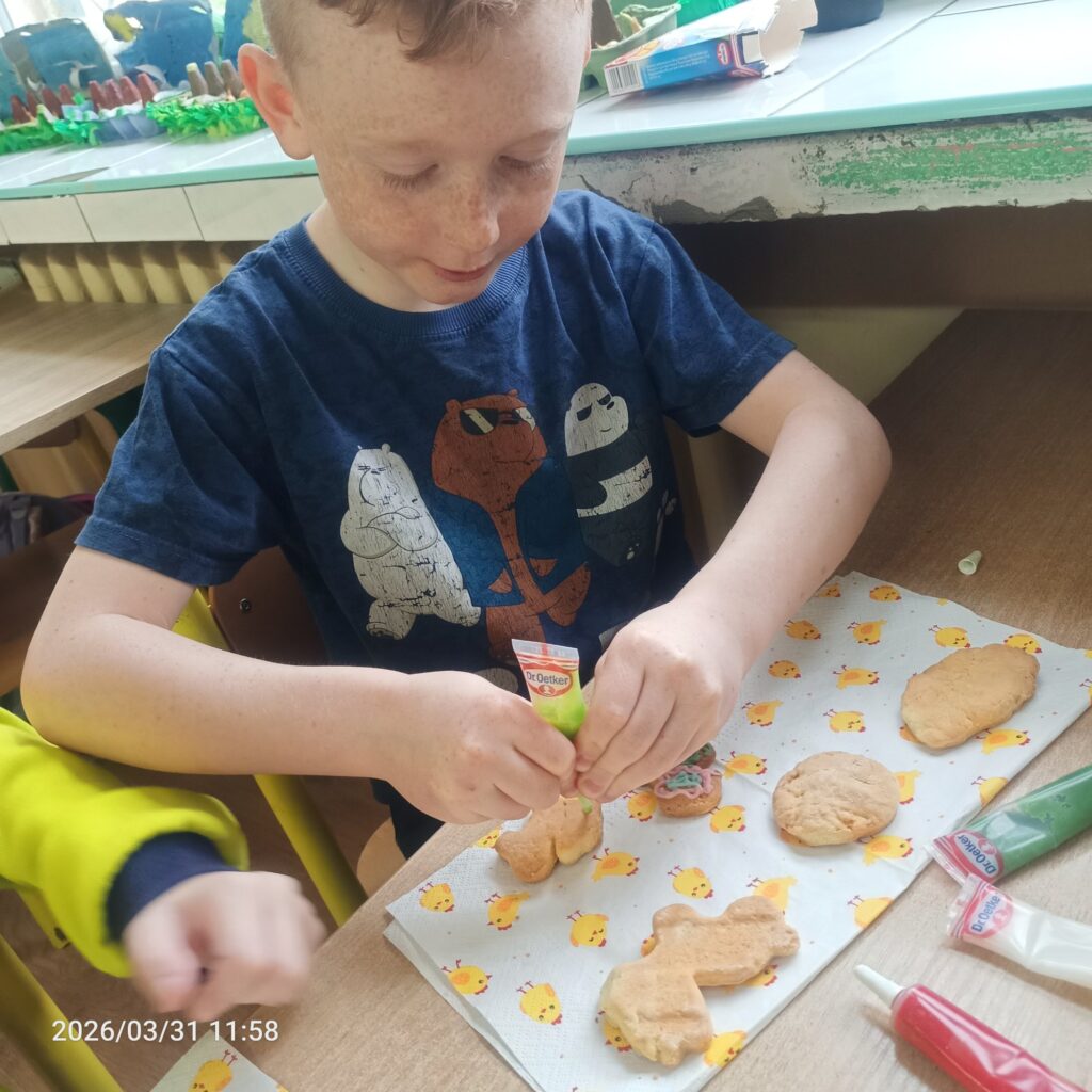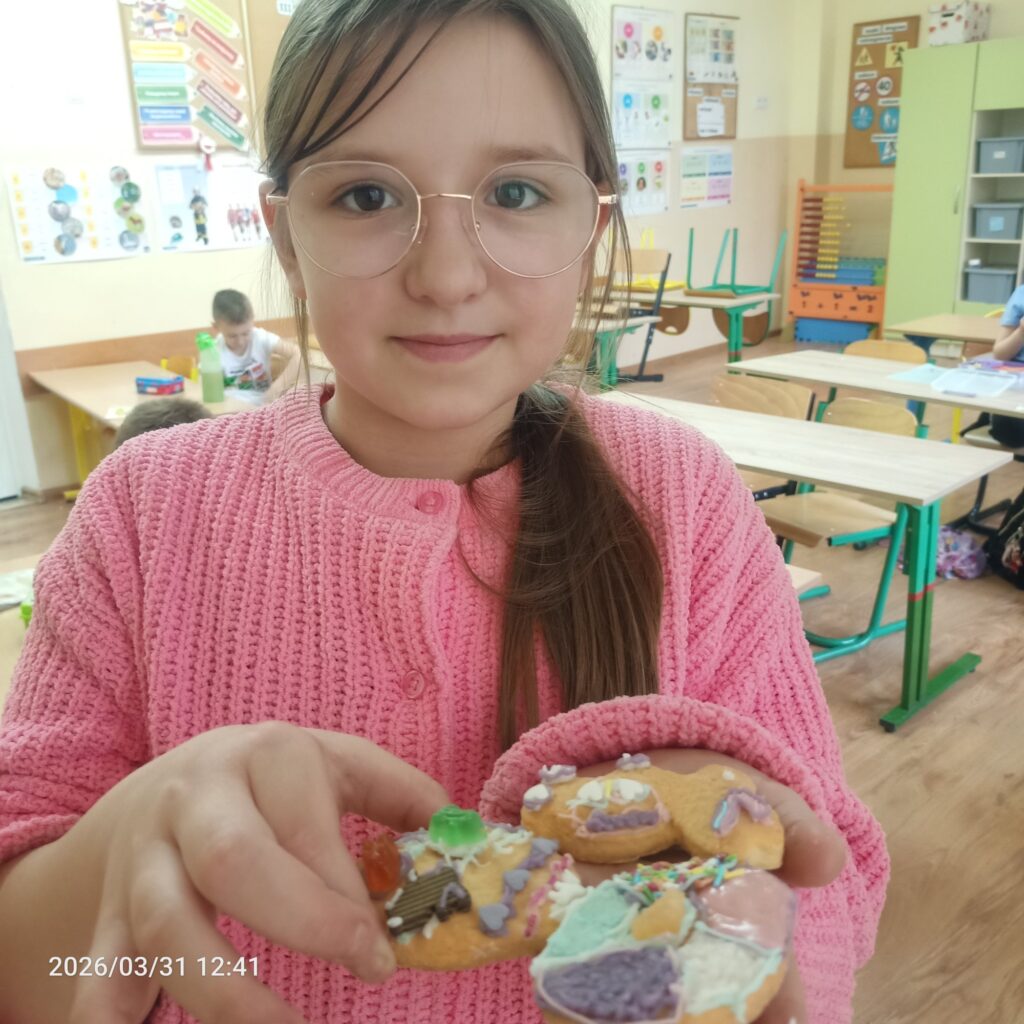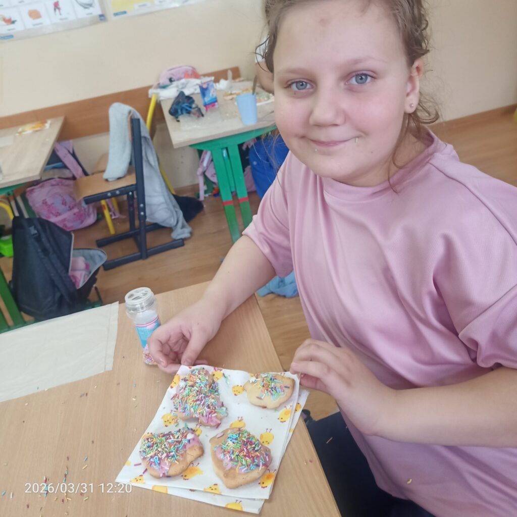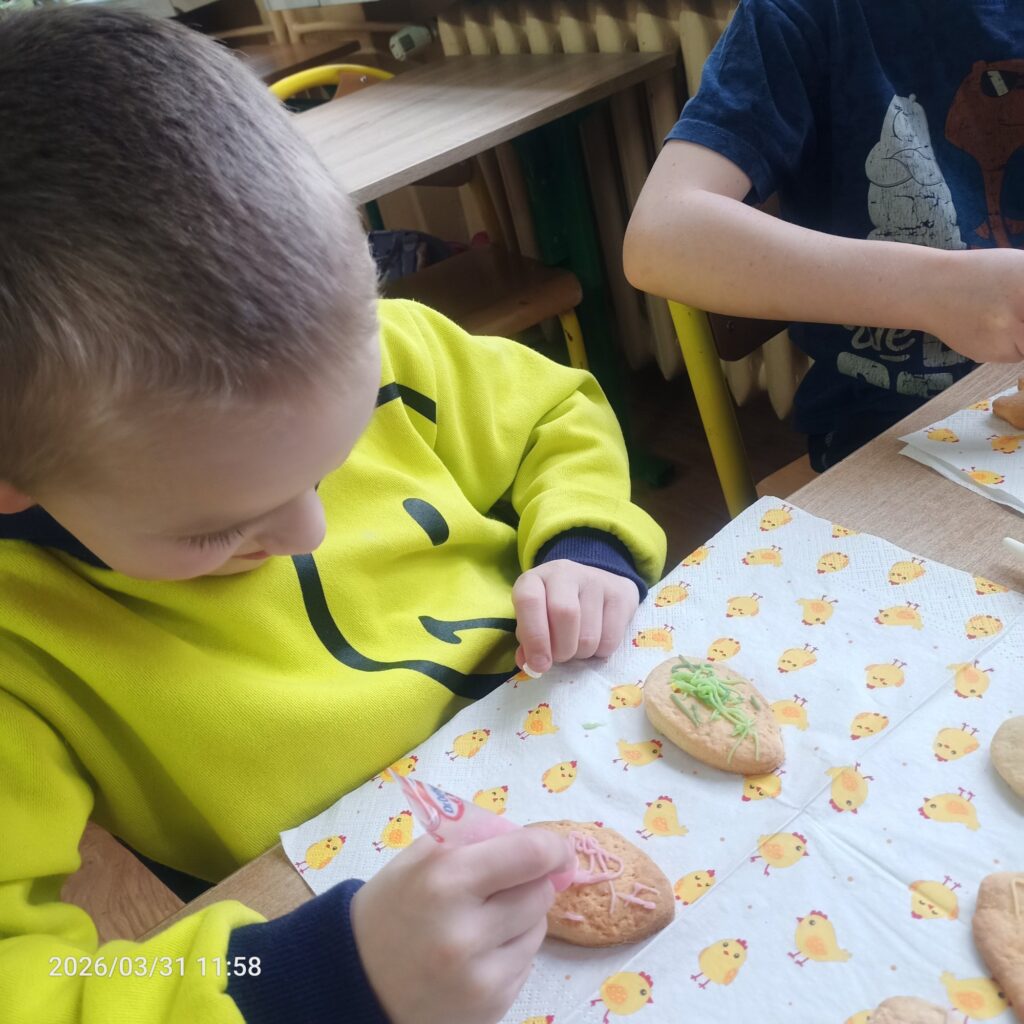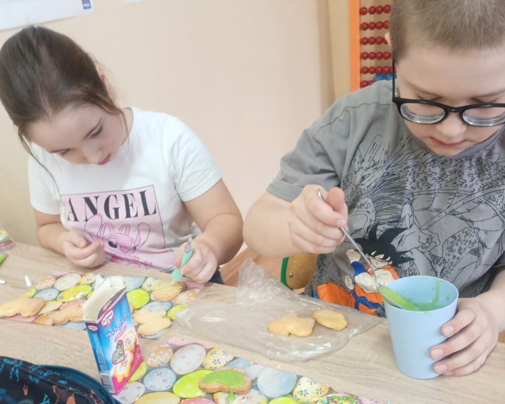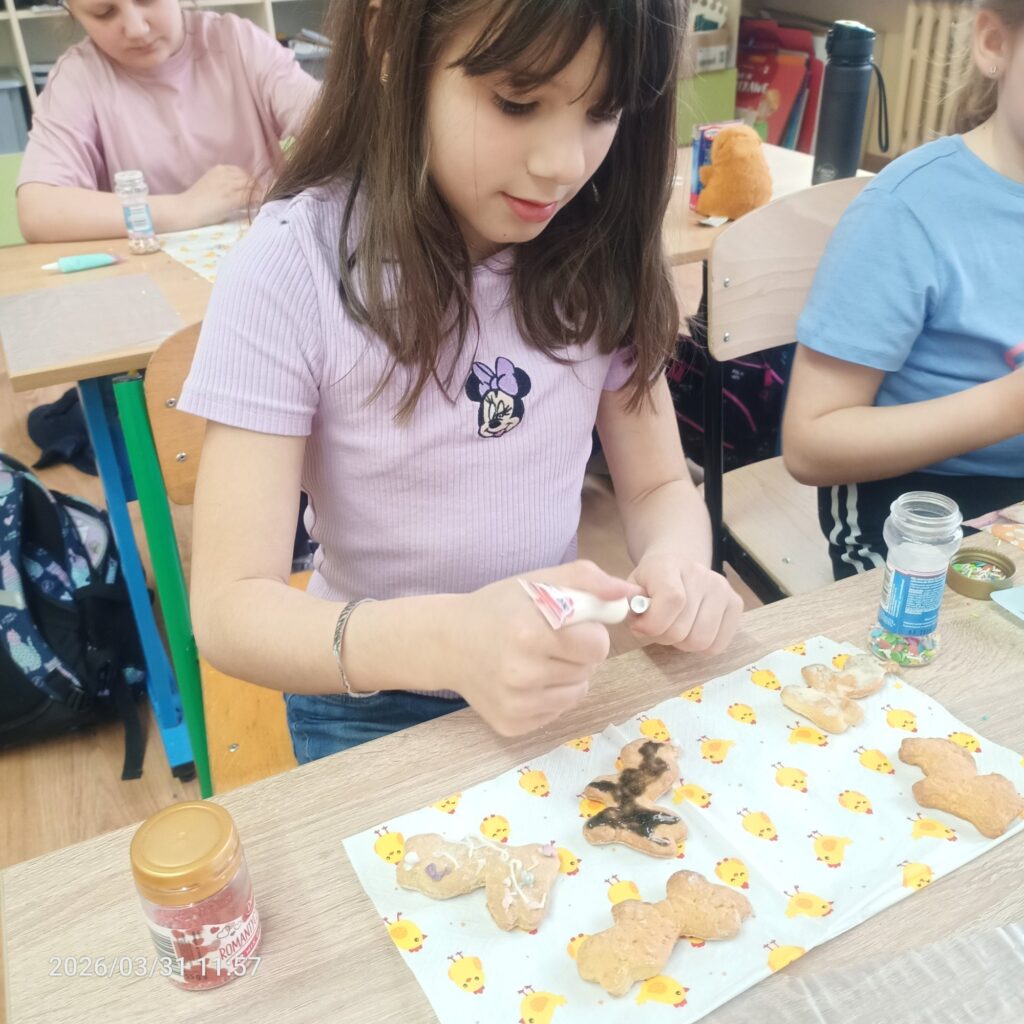Uczniowie klasy 2c z radością przygotowują się do nadchodzących świąt. Sala lekcyjna na chwilę zamieniła się w prawdziwą cukiernię – dzieci najpierw upiekły pachnące ciasteczka w kształcie kurczaczków, króliczków i jajek, a następnie z ogromnym zaangażowaniem ozdabiały je według własnych, pomysłowych projektów.