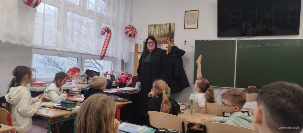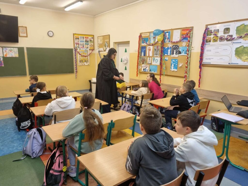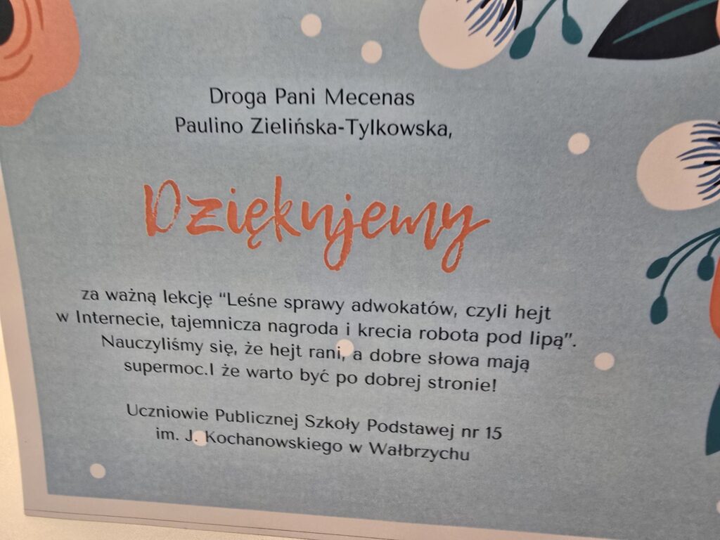 Uczniowie poznali także pojęcia takie jak ugoda i kompromis oraz mieli okazję przymierzyć adwokacką togę. Na zakończenie wręczyli pani adwokat podziękowanie, na którym własnoręcznie się podpisali. Zgodnie podkreślali, że w Internecie – podobnie jak w codziennych relacjach – warto wybierać życzliwość i szacunek zamiast hejtu.