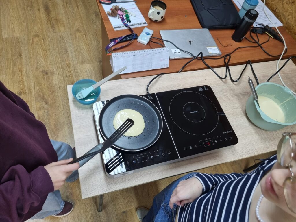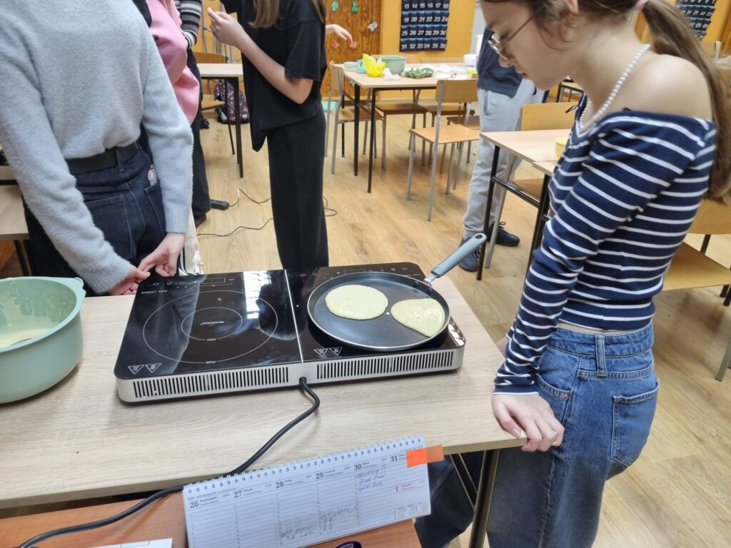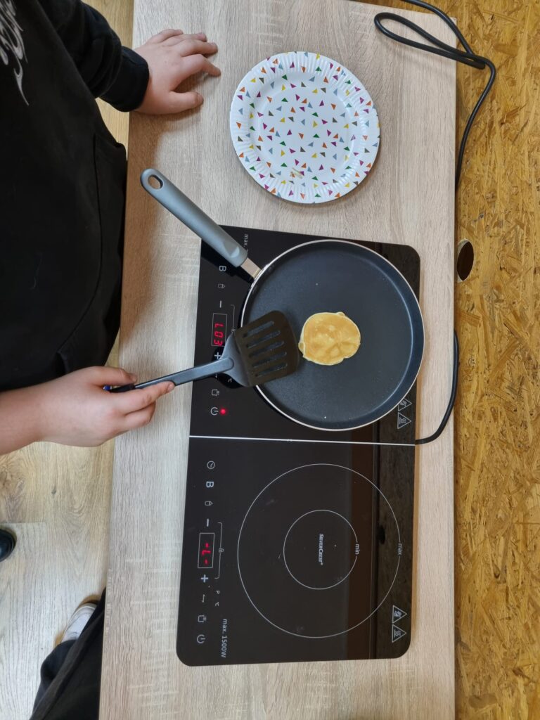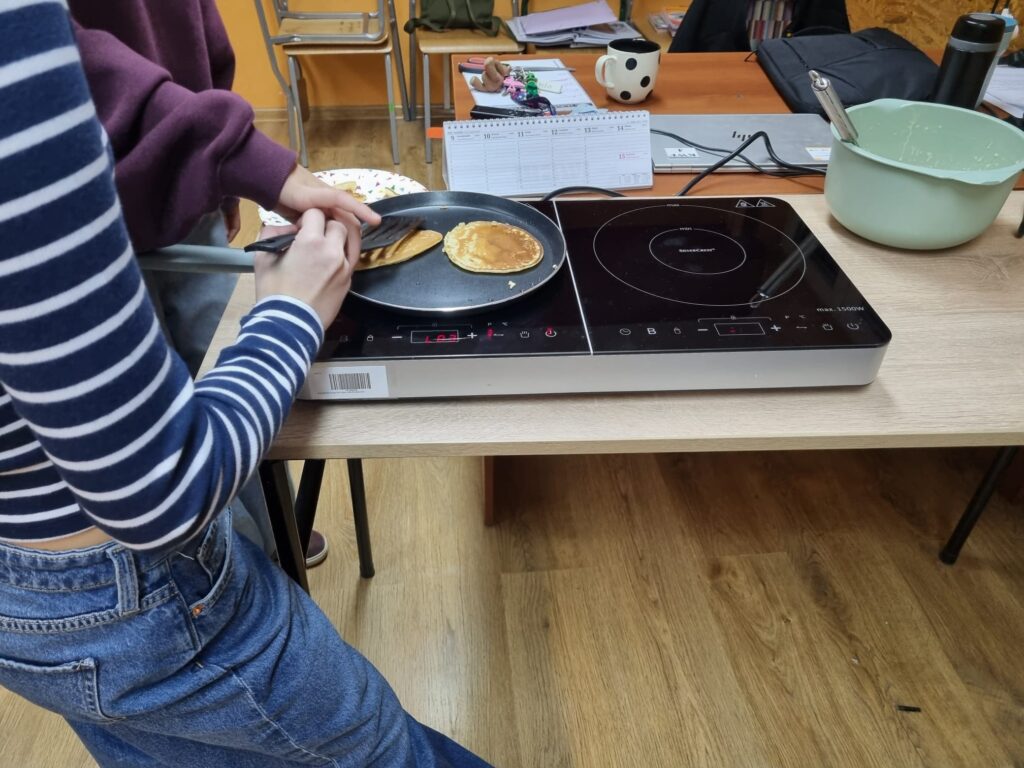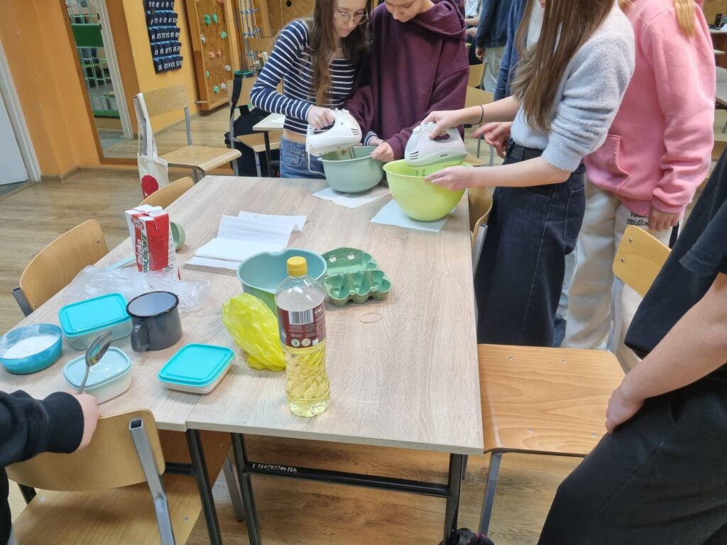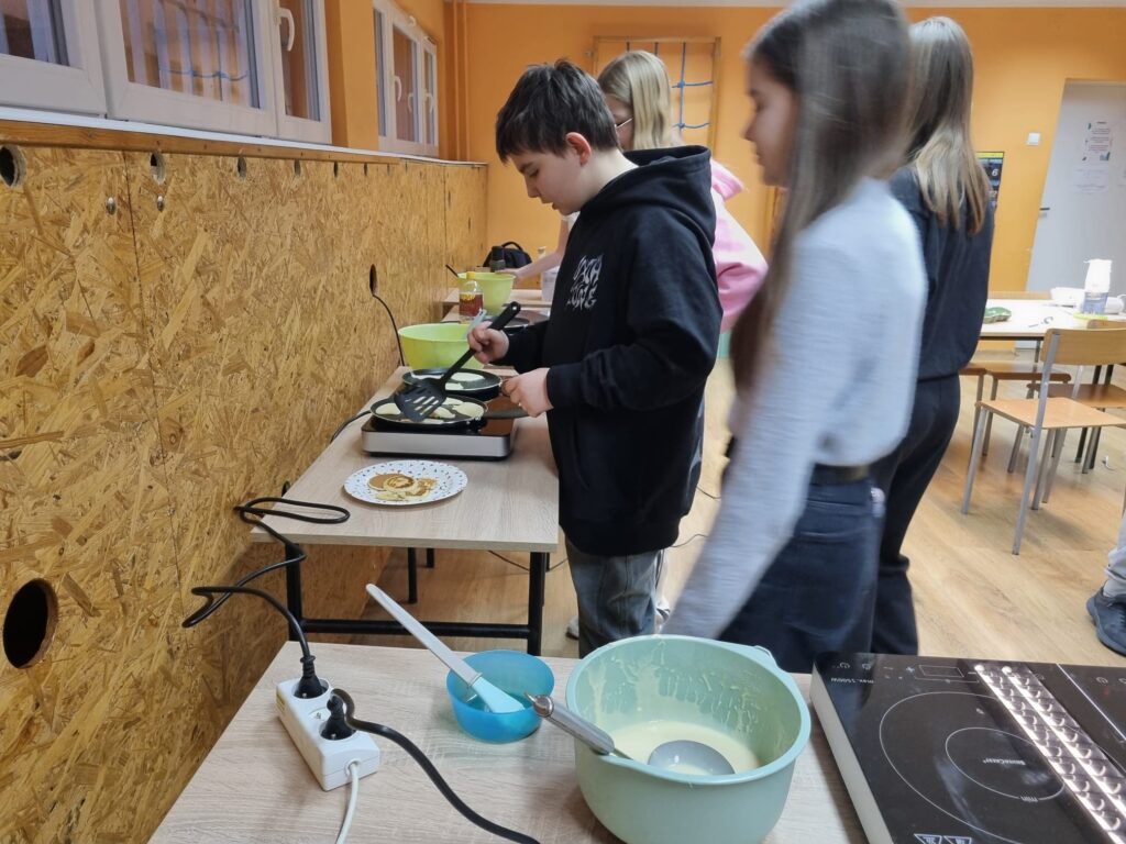 Każdy uczestnik zajęć miał swoje zadanie: jedni przynieśli składniki, inni zajmowali się mieszaniem, smażeniem lub porządkowaniem stanowiska pracy. Wspólne gotowanie pokazało, że efekt końcowy zależy od zaangażowania wszystkich, a różnice zdań czy sposobów działania nie są przeszkodą, lecz szansą na naukę współpracy i wzajemnego szacunku.