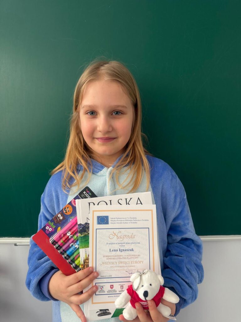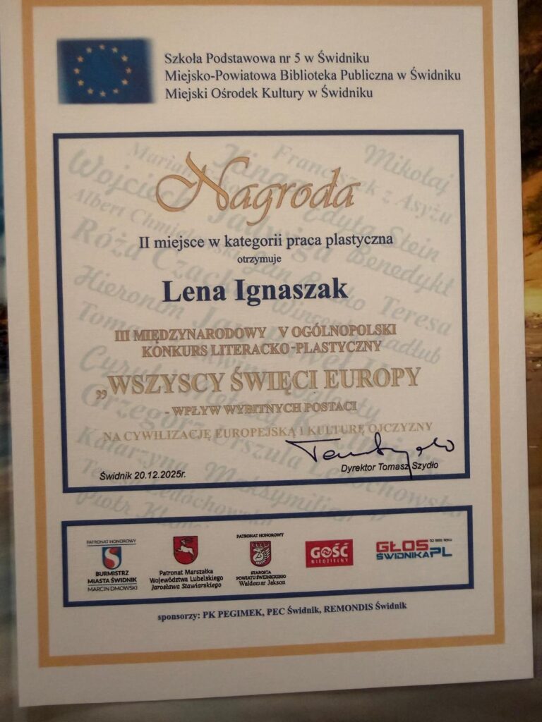 Z radością informujemy, że uczennica naszej szkoły, Lena Ignaszak, zajęła drugie miejsce w kategorii praca plastyczna w III Międzynarodowym oraz V Ogólnopolskim Konkursie Literacko-Plastycznym „Wszyscy Święci Europy – Wpływ wybranych postaci na cywilizację europejską i kulturę ojczyzny”. Lence serdecznie gratulujemy!
