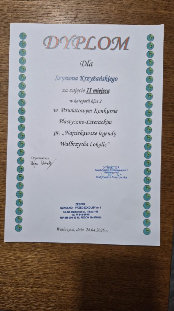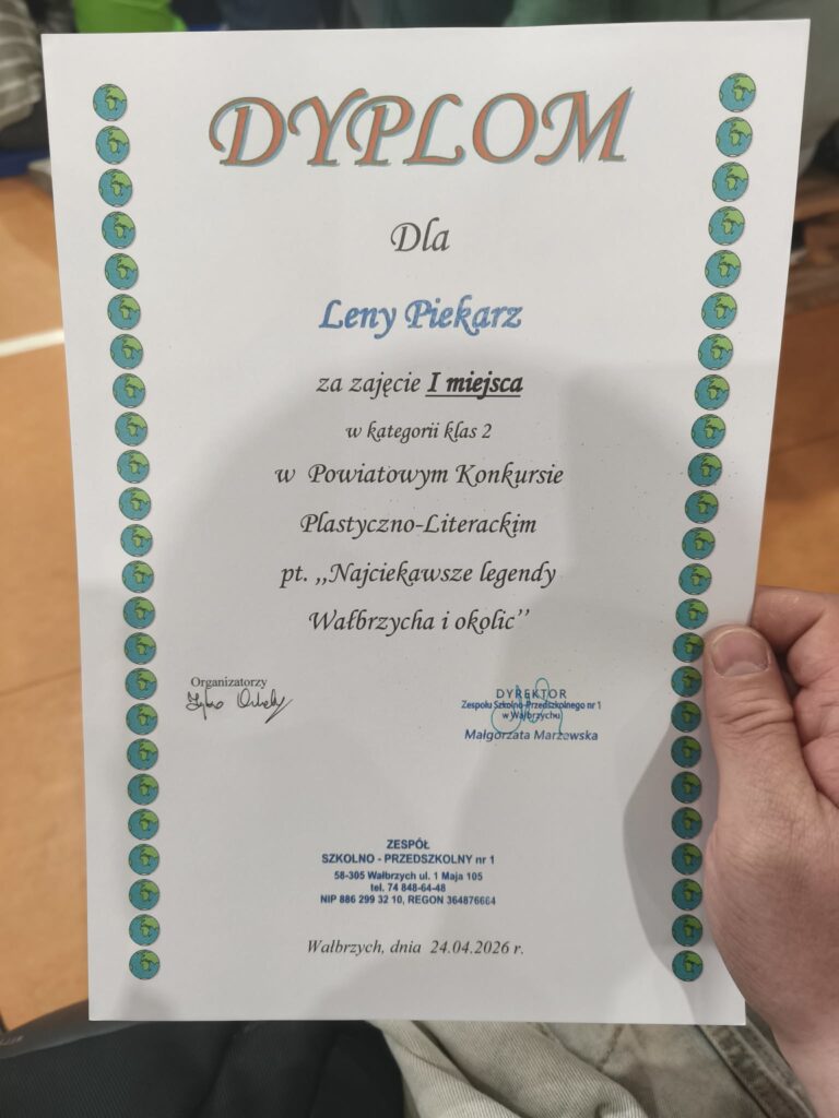 Uczniowie klasy 2b wzięli udział w Powiatowym Konkursie Literacko–Plastycznym pt. „Najciekawsze legendy Wałbrzycha i okolic”, organizowanym przez Zespół Szkolno-Przedszkolny nr 1 w Wałbrzychu. Udział w konkursie był zwieńczeniem cyklu zajęć, podczas których uczniowie poznawali legendy Wałbrzycha i okolic, rozwijając swoją wiedzę o regionie oraz inspirując się do twórczych działań literackich i plastycznych.
